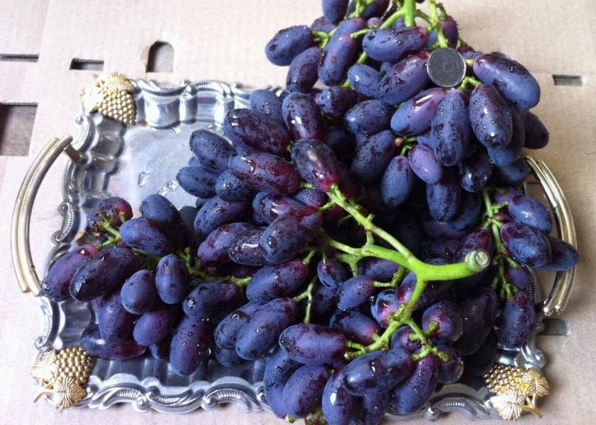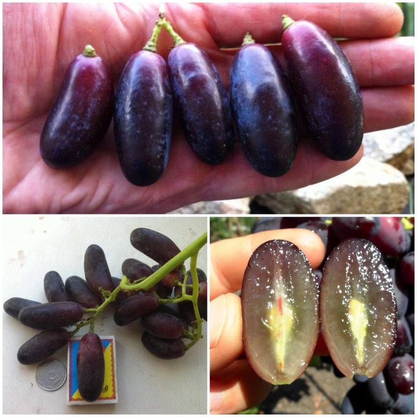 Ягода очень крупная, удлиненная, иногда серповидная. Отдельные ягоды могут достигать до 5 см в длину. Окрас темно-фиолетовый. Вкус гармоничный. Мякоть мясисто-сочная с подхрустом при раскусывании. Кожица не ощущается.