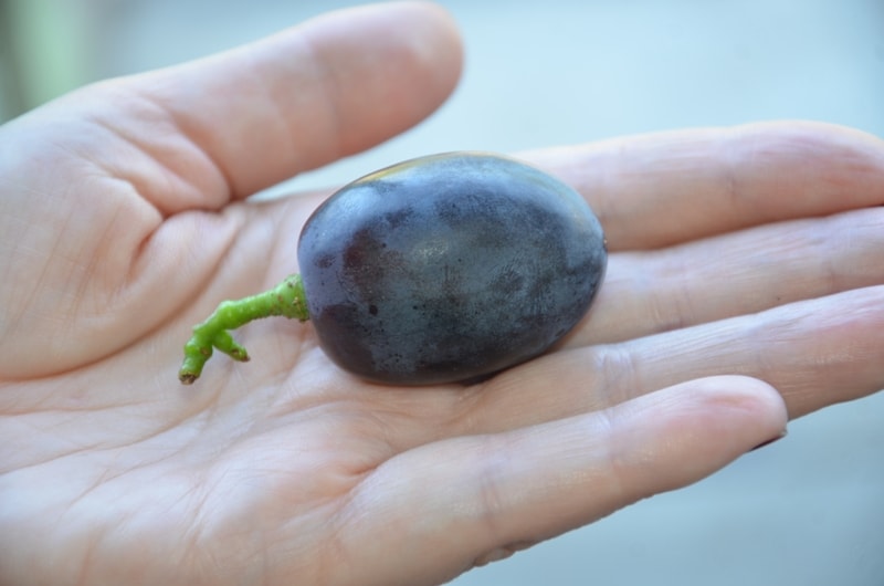 Окрас равномерный, практически черный при полном созревании. Форма ягод овальная с слегка заостренным кончиком. Поверхность слегка бугроватая с прожилками. Смотрится очень интересно и привлекательно.